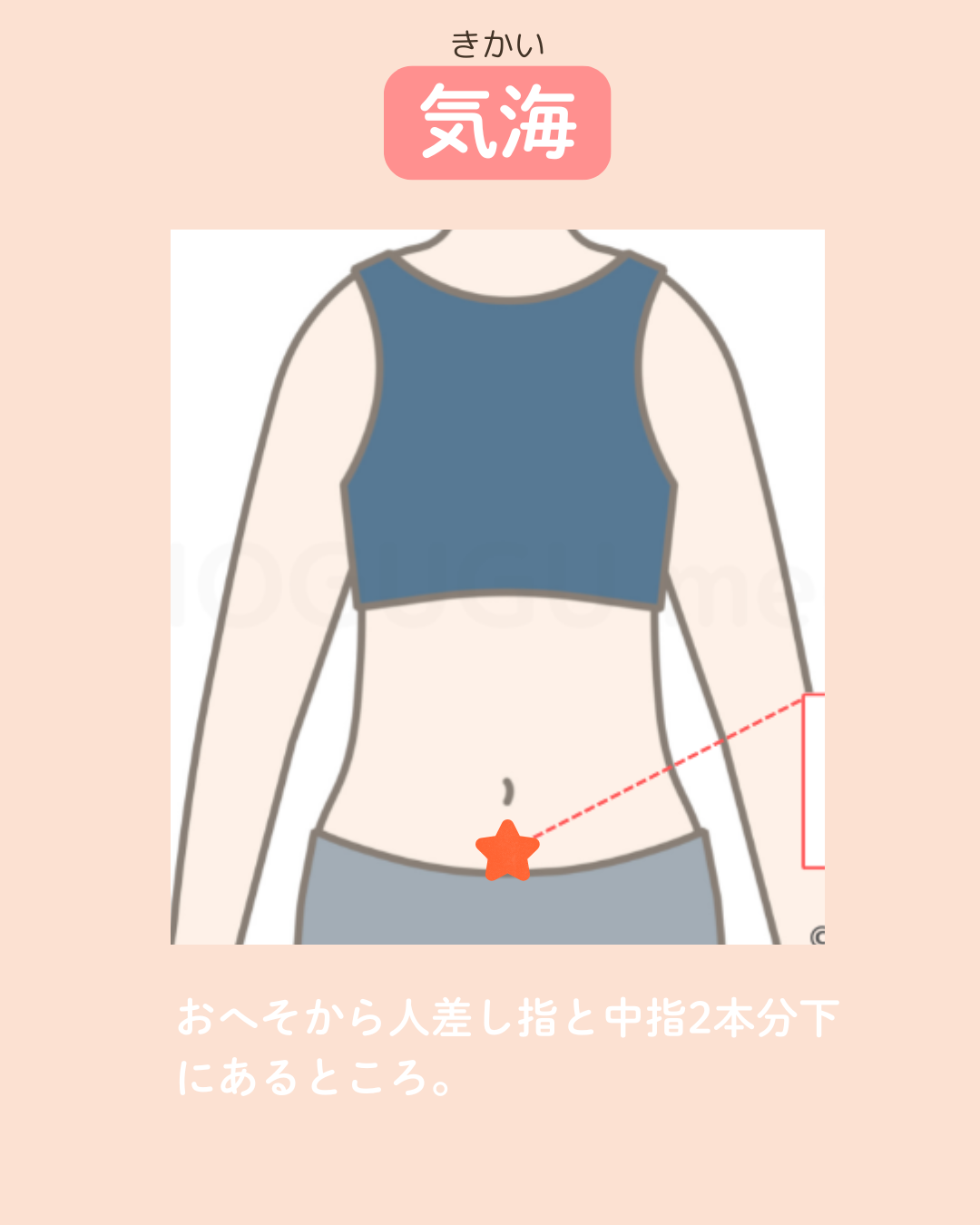「気の集まる場所」とされ、腹部を温めて全身のエネルギーを巡らせます。